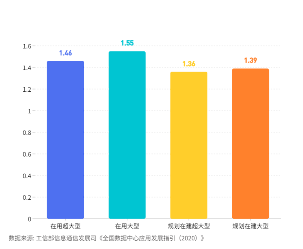 全国数据中心能效水平不断提升。根据 CDCC 统计分析,2021 年度全国数据中心平均 PUE 为 1.49,相较于 2019 年全国平均 PUE 近 1.6,全国数据中心 PUE 已有所提升。其中华北、华东的数据中心平均 PUE 接近 1.40,处于相对较优水平。华中、华南地区受地理位置、上架率及其他多种因素的影响,数据中心平均 PUE 值接近 1.6,存在较大的提升空间。