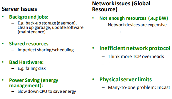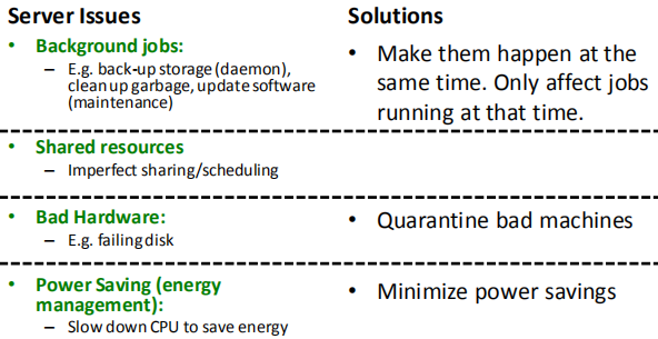 例如,考虑一个系统,在这个系统中,每个服务器通常的响应时间为10毫秒,但第99百分位的响应时间将达到一秒。如果一个用户请求仅在一个这样的服务器上处理,那么100个用户请求中会有一个请求变慢(一秒)。右图描述了在这种假设情景中,非常小的延迟异常所导致的服务级别延迟的影响。如果一个用户请求必须并行地从100个这样的服务器收集响应,则63%的用户请求将需要超过一秒的时间(在图表中标记为“x”)。即使对于只有万分之一的请求在单个服务器上经历超过一秒延迟的服务,有2,000个这样的服务器的服务也会导致近五分之一的用户请求需要超过一秒的时间(在图表中标记为“o”)。